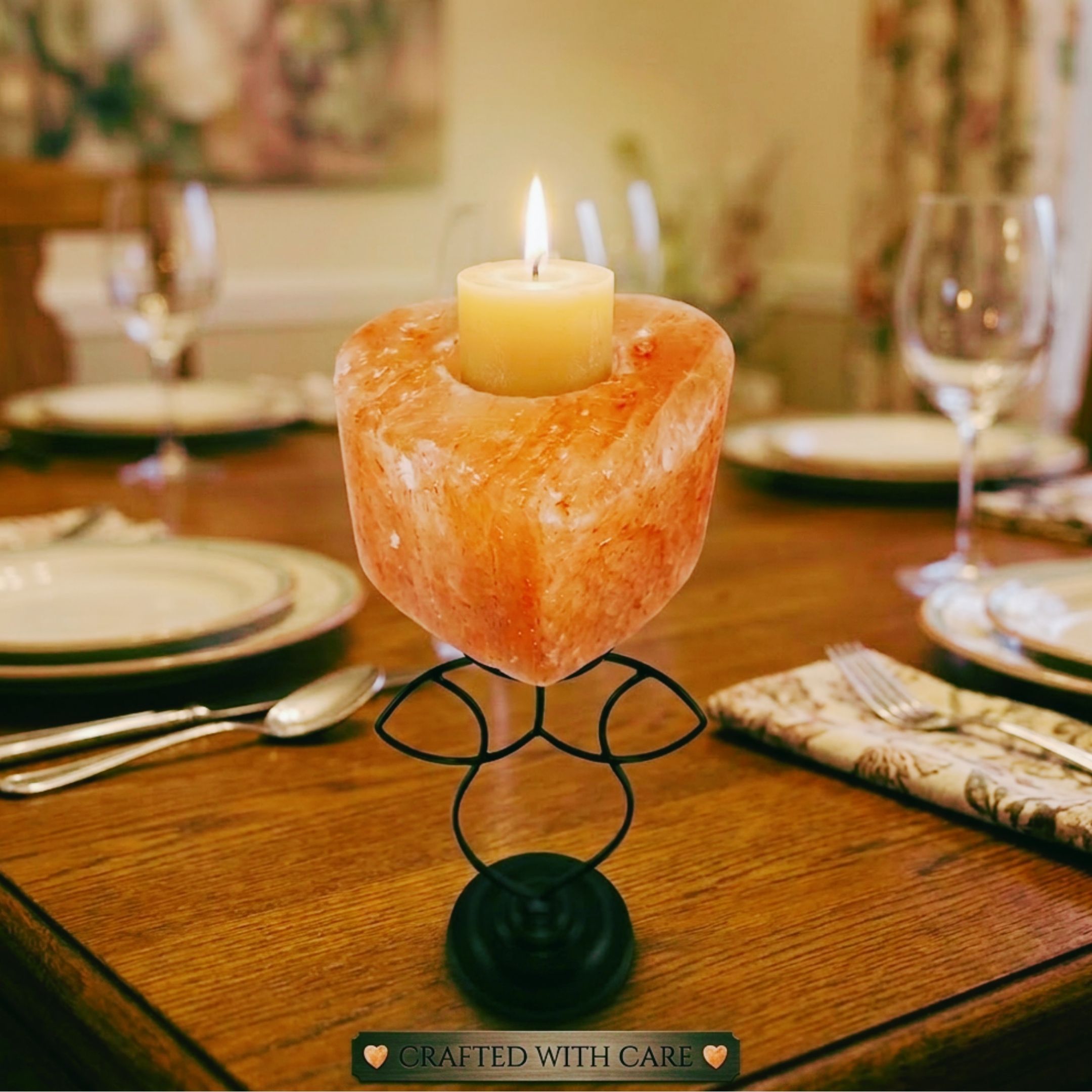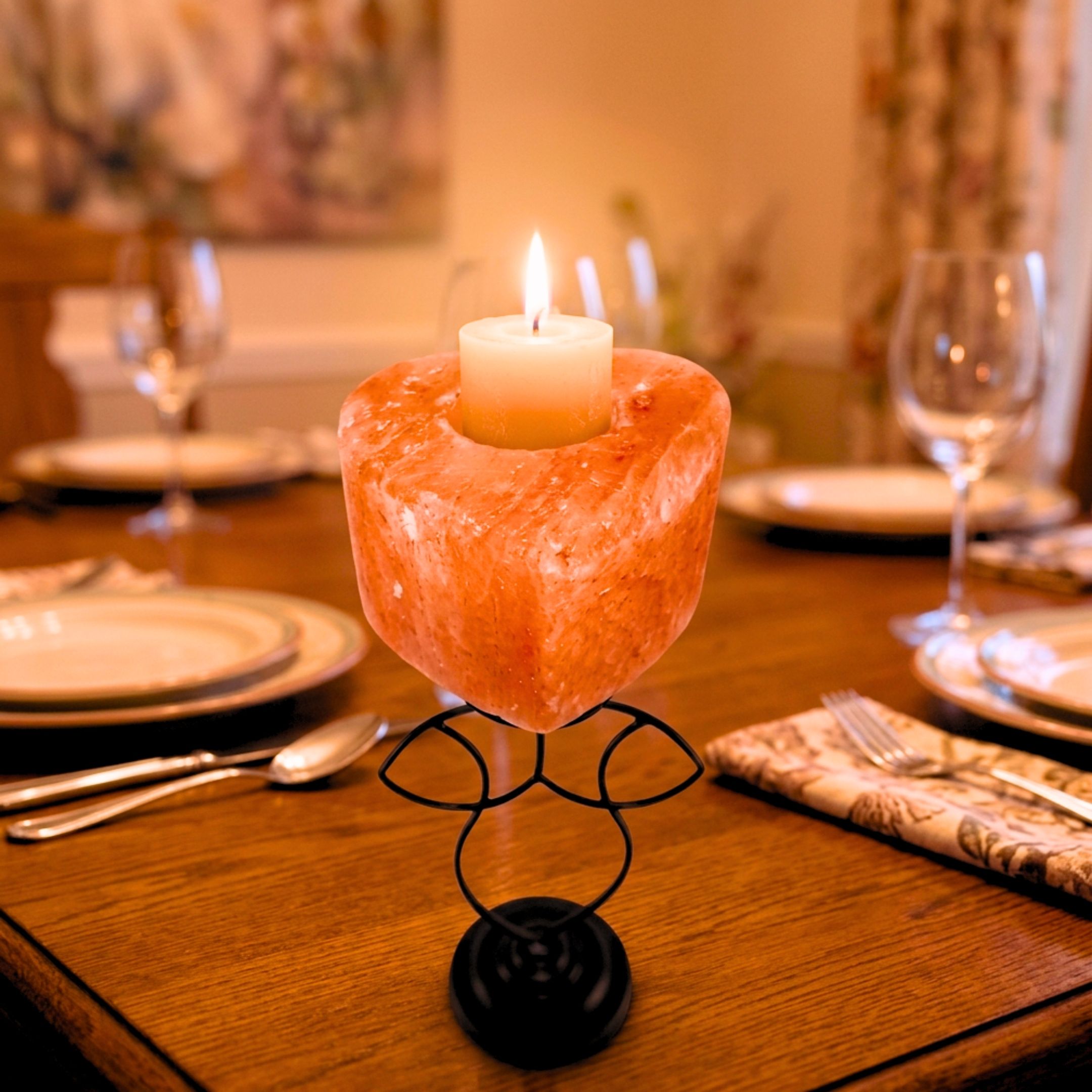 Add warmth and elegance to your space with this Heart Shape Candle Holder with Metal Stand, handcrafted from 100% natural Himalayan salt crystal.