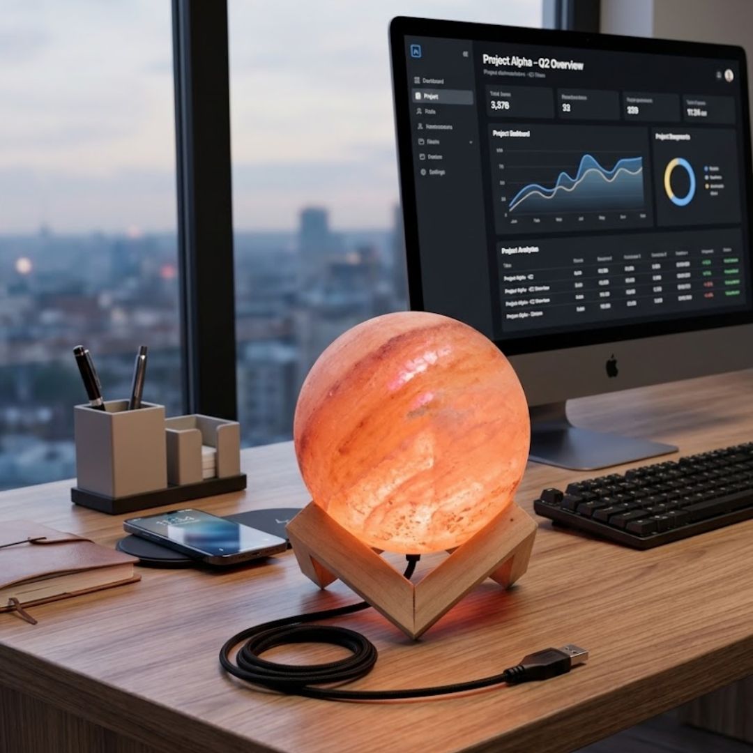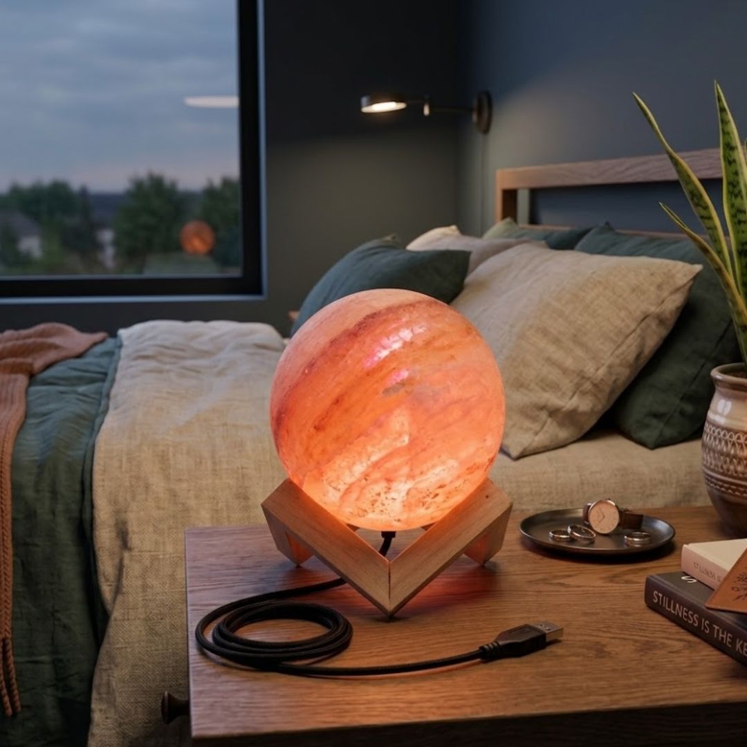 The natural pink salt glow combined with a moon design creates a stunning aesthetic and peaceful environment.