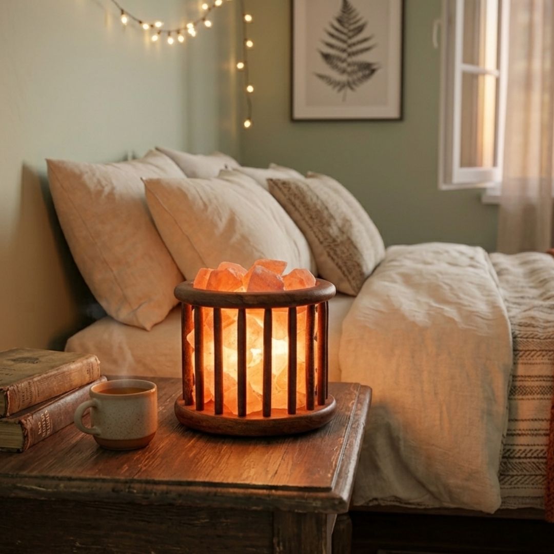 The cage structure enhances light diffusion, casting beautiful patterns and shadows while highlighting the raw texture of the salt crystals. This unique design blends rustic craftsmanship with modern aesthetics, making it ideal for homes, cafés, spas, and wellness environments.